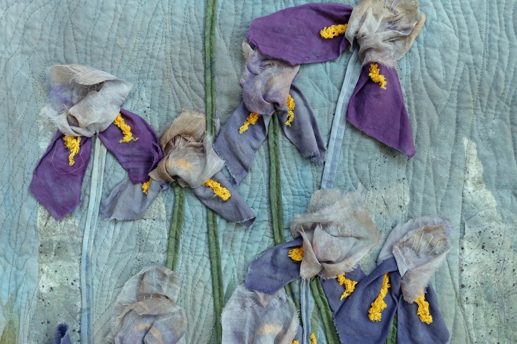 Trying to break out of an unproductive time, I am revisiting my earth thoughts. Here a collage of hand dyed and manipulated fabric and paper.