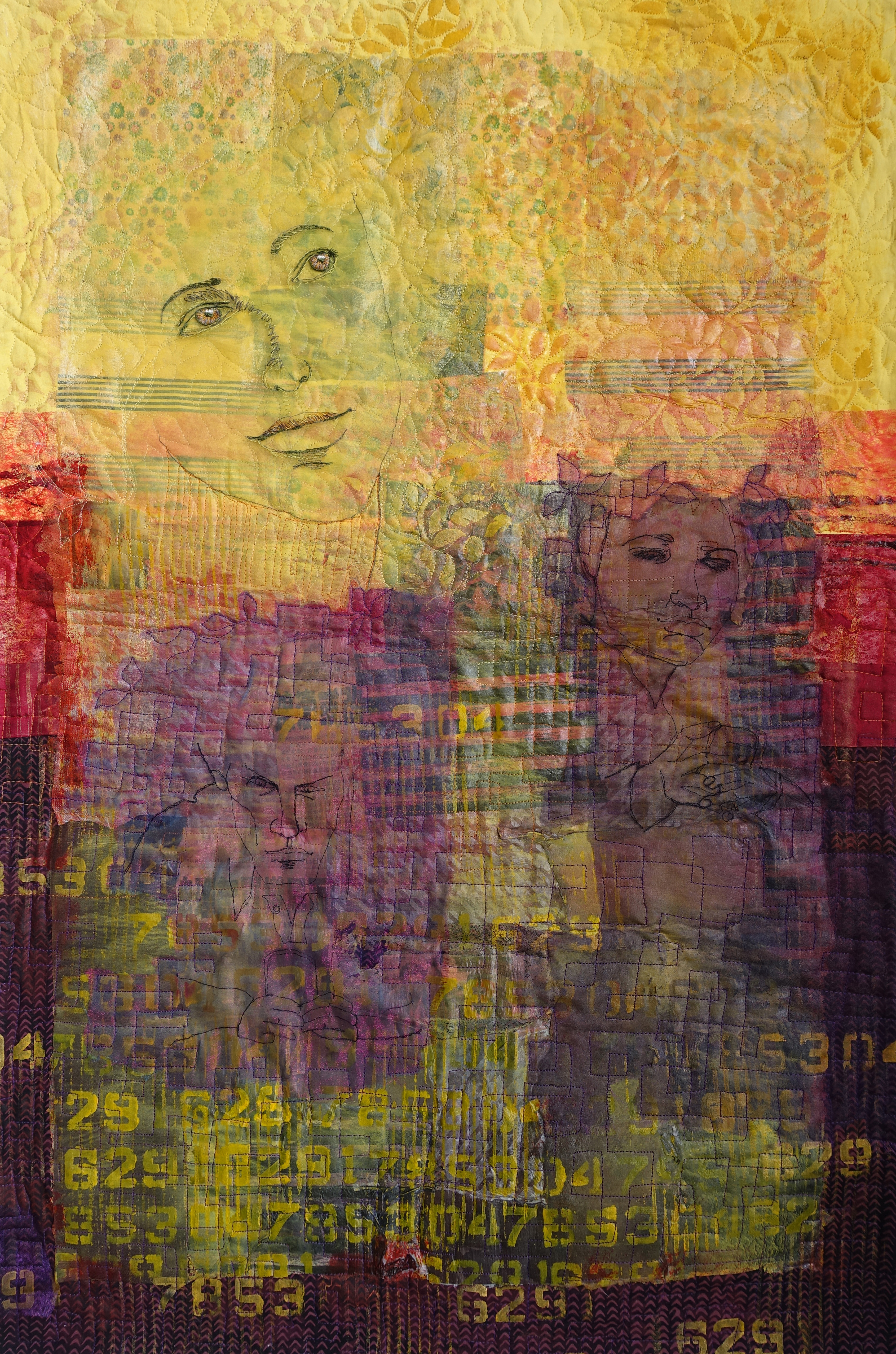 sewing machine and hand embroidered drawings on organza layered over a collage of paper and fabric, dyed, printed