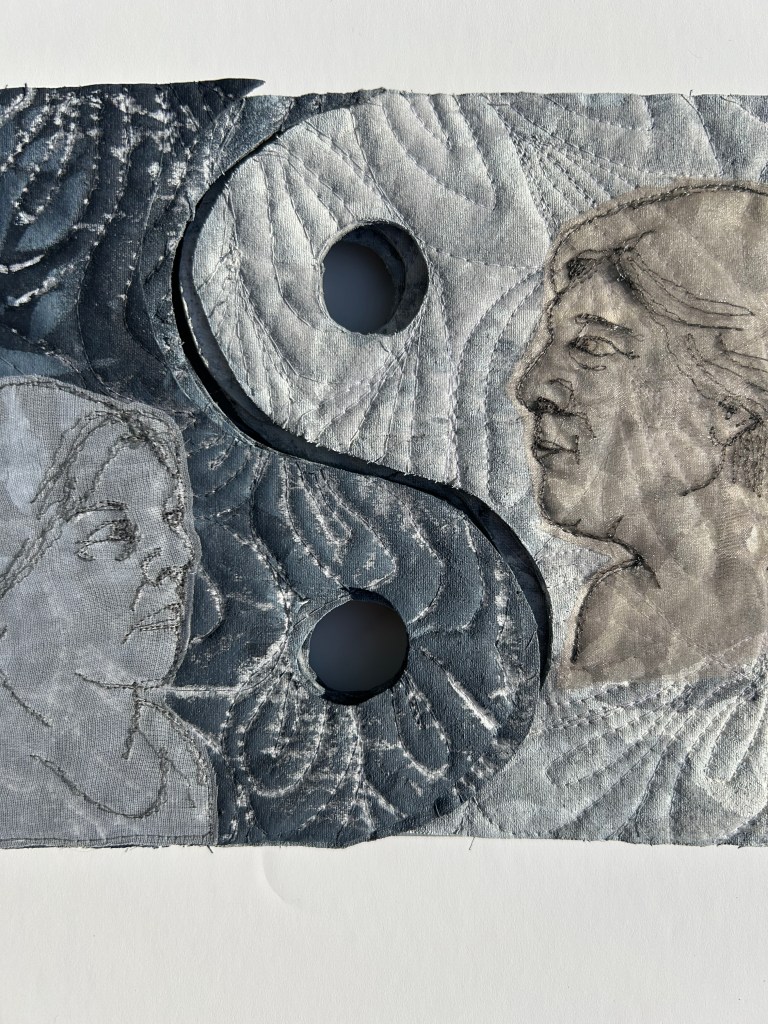 This book has a gatefold structure with coptic stitching on either side. The portraits are drawn with the sewing machine on recycled art quilt scraps from another project.