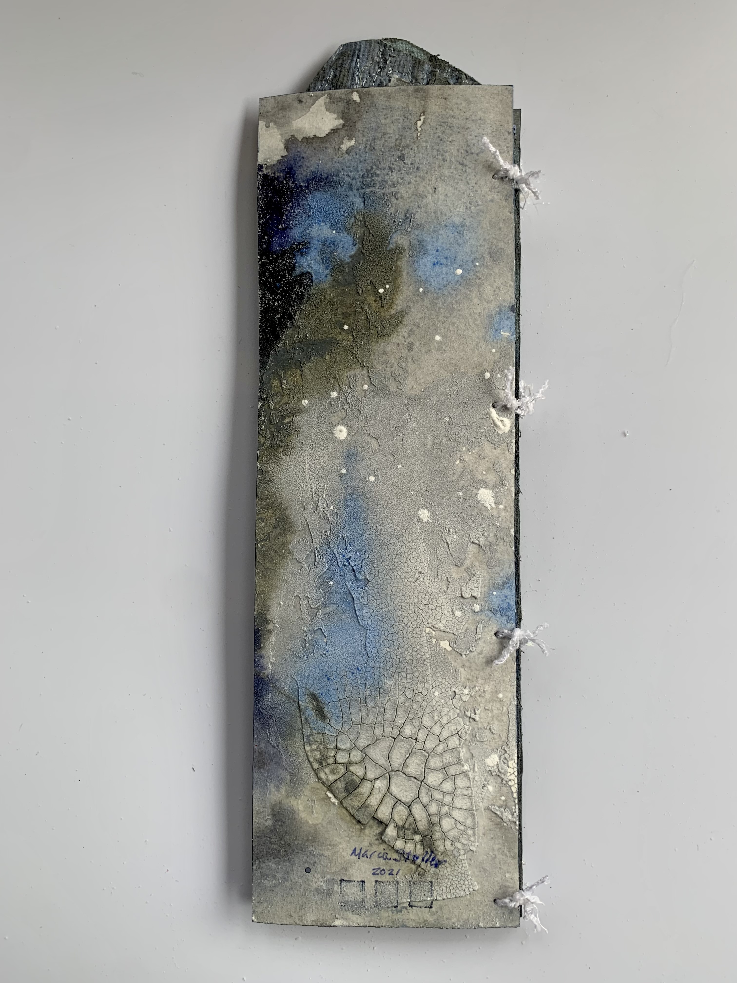 Photo collage on recycled quilt. Acrylic paint on watercolor papers for the covers.