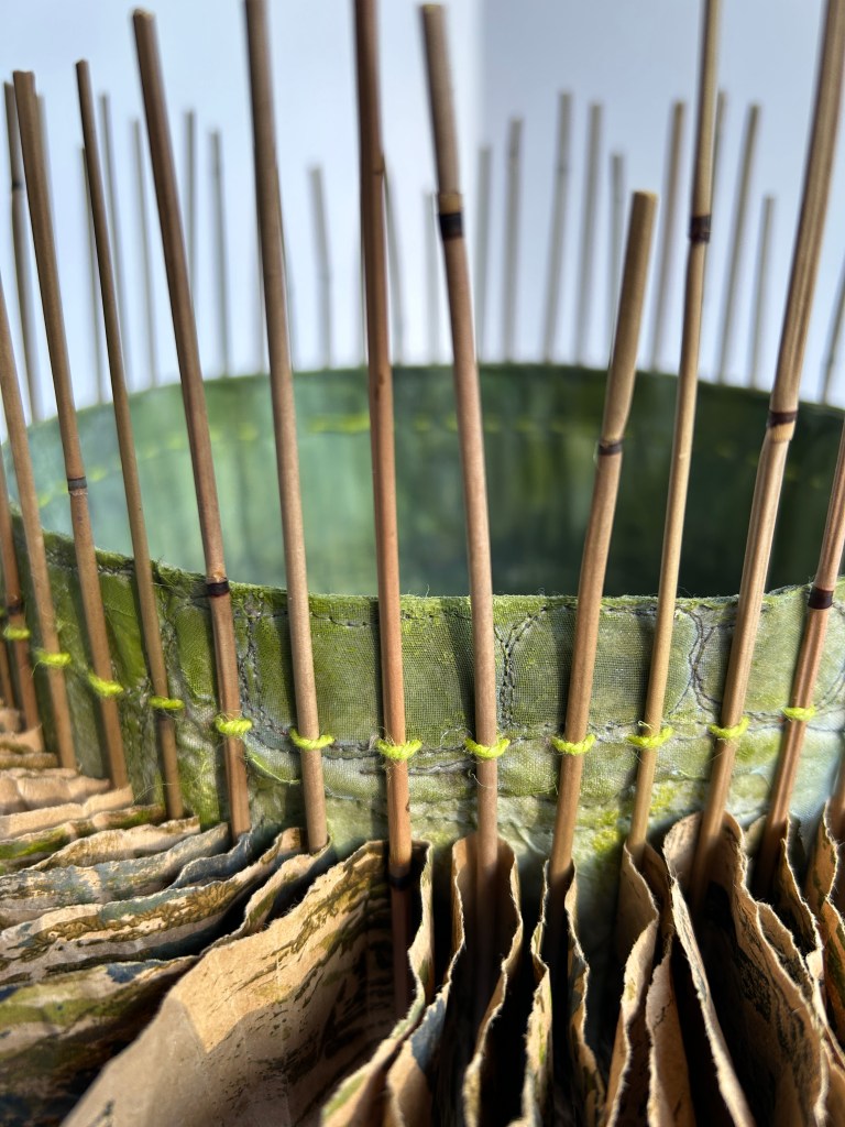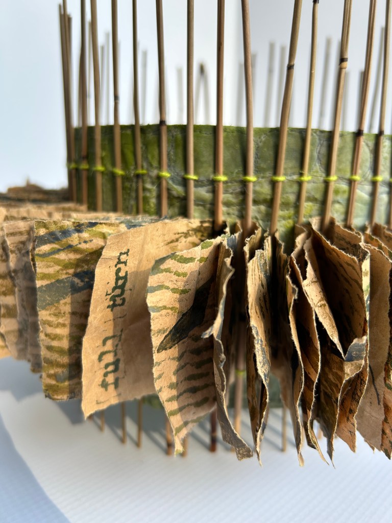 I recycled an older art quilt for the middle, the pages are recycled shopping bags, bound with fine bamboo sticks.