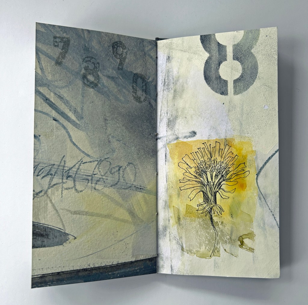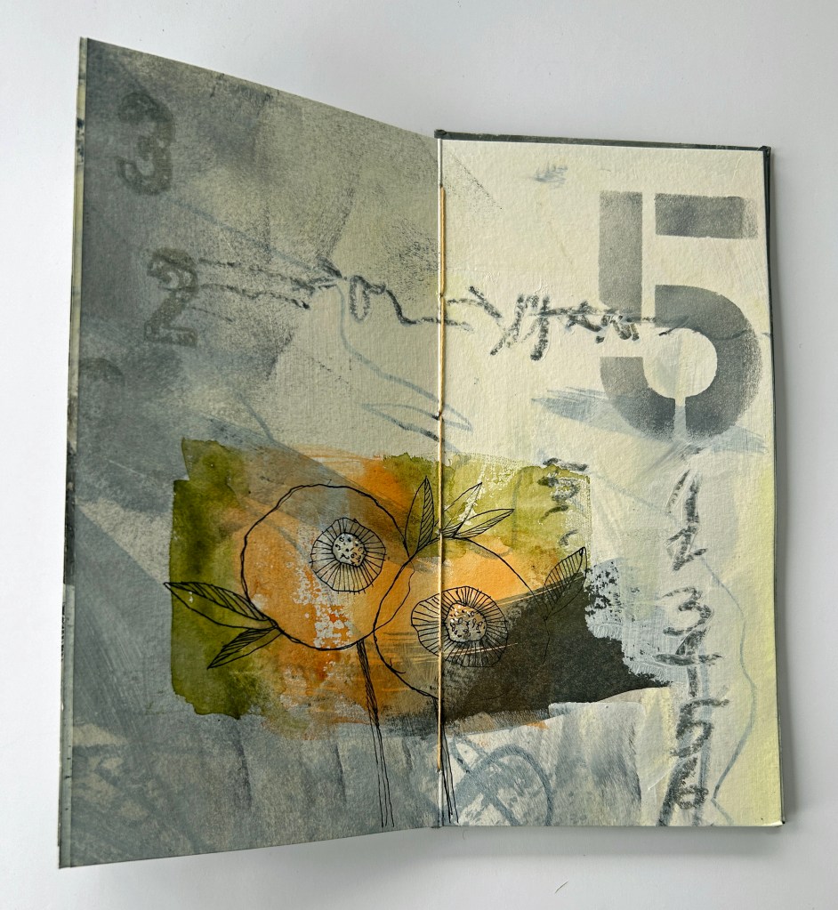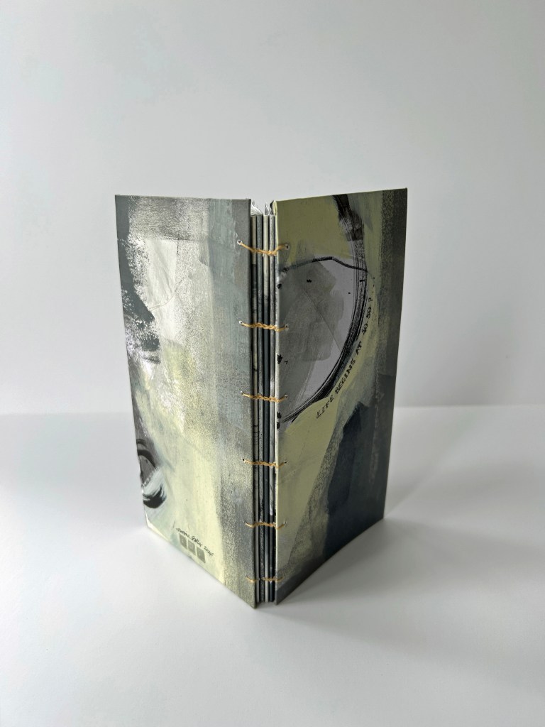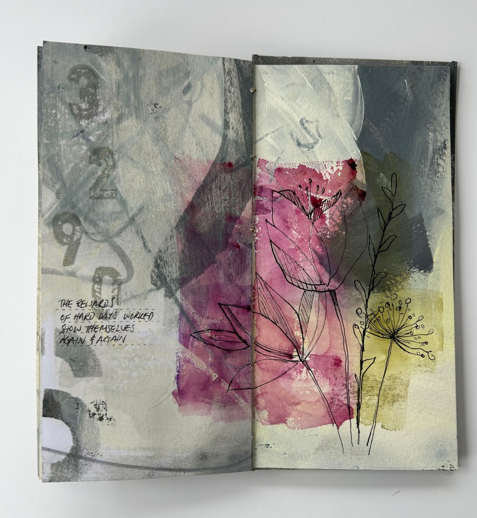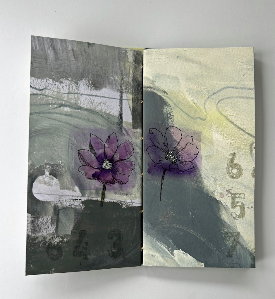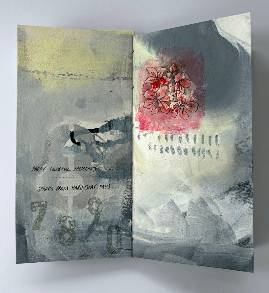 Hand painted hard gray days accented by a spot of colorful flowers. The rewards for hard days worked show themselves again and again. Coptic binding.