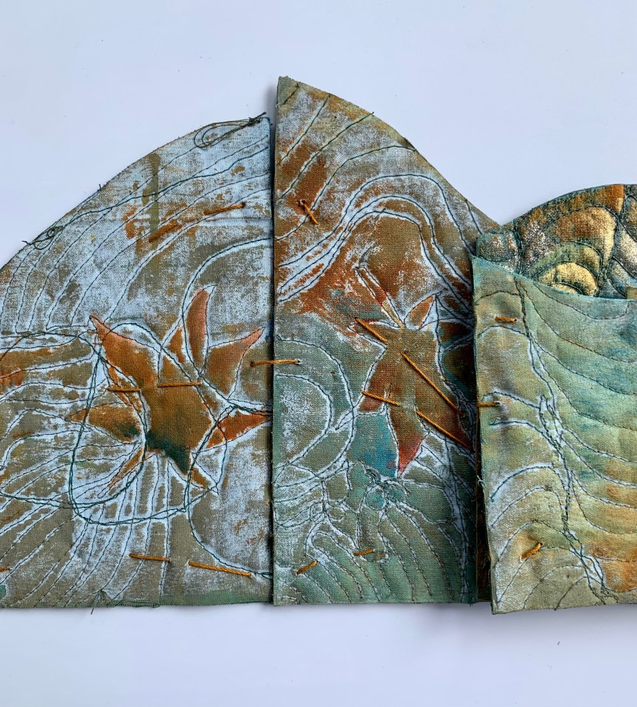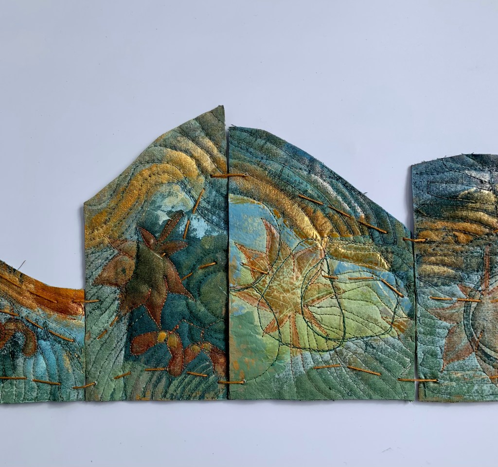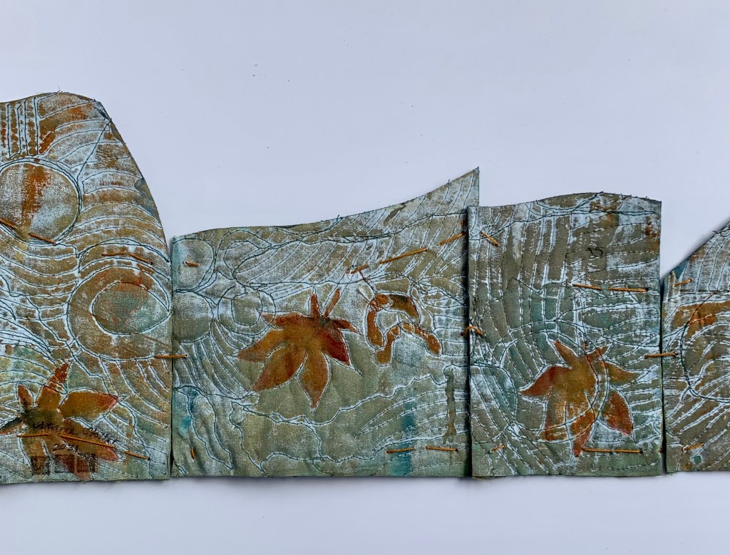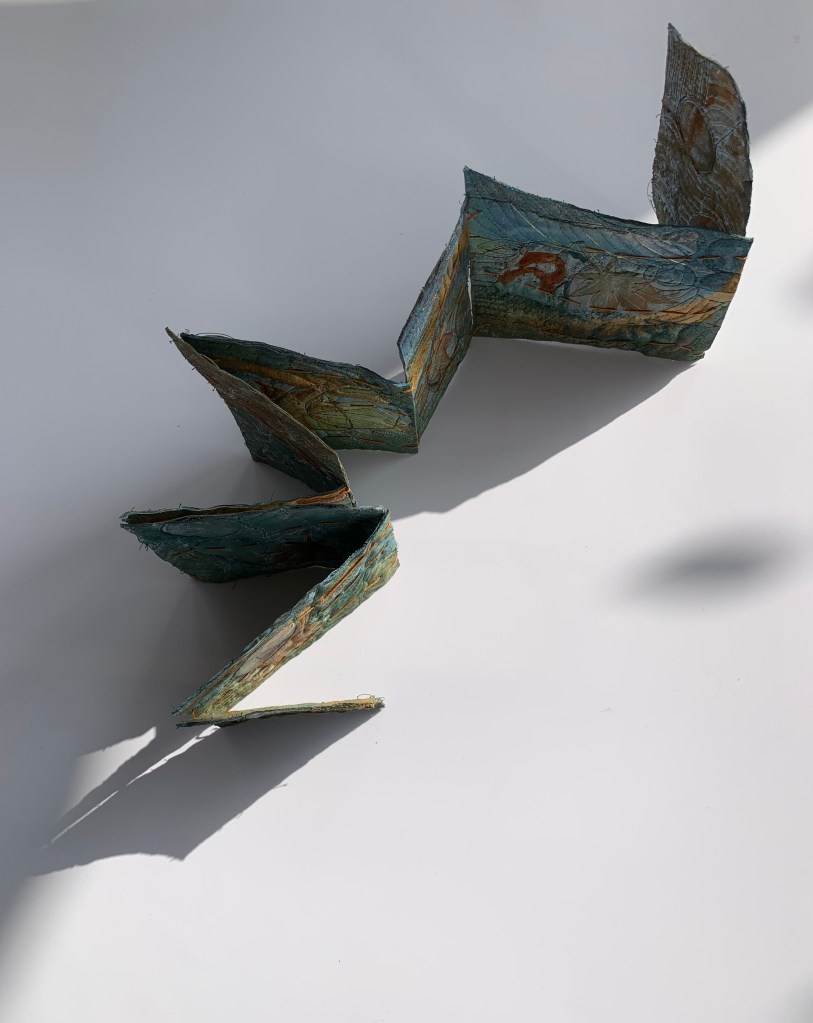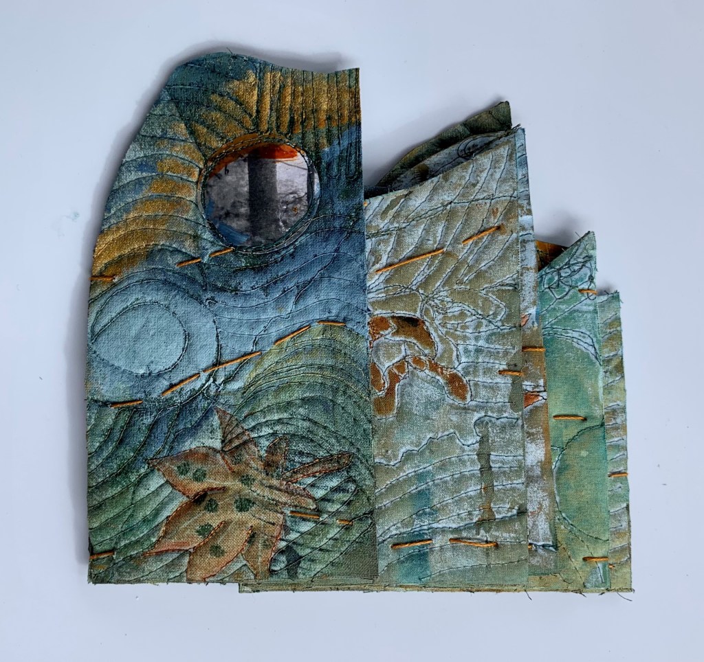Accordion book structure using collage, handmade stamp, acrylic paint and embroidery on a recycled book.