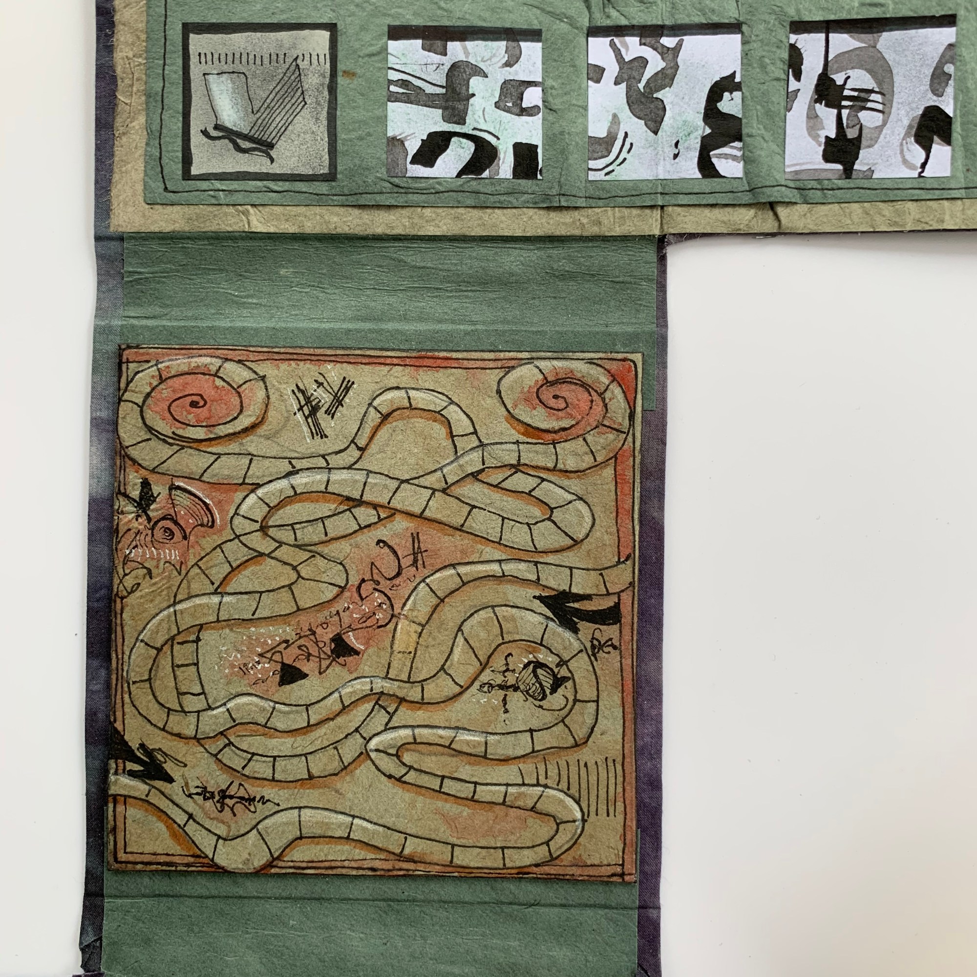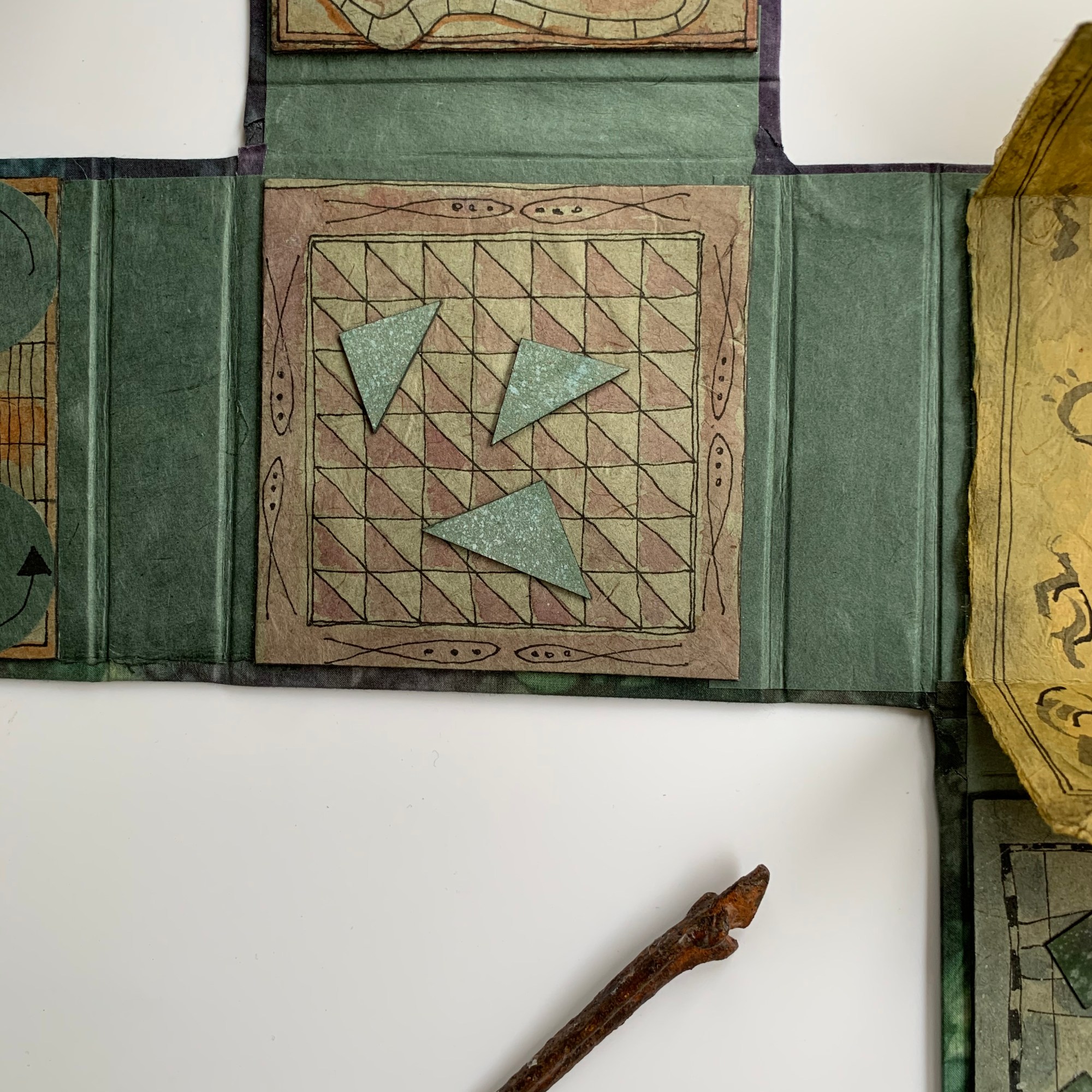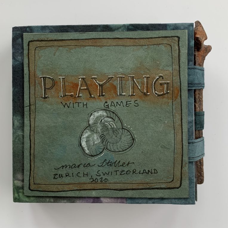 I used the idea of asemic writing and created an asemic game board. You can almost recognize each gameboard. A fun challenge and a true book binding lesson.