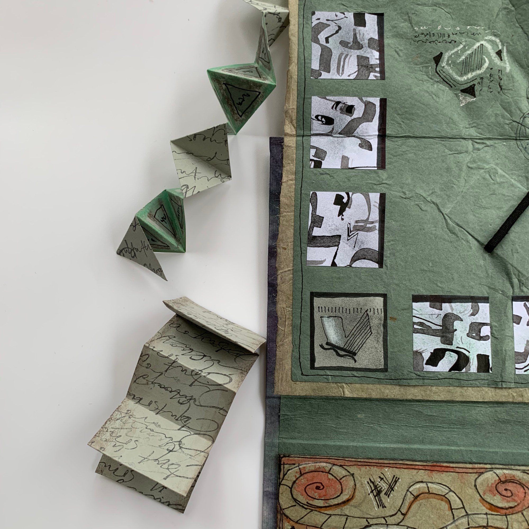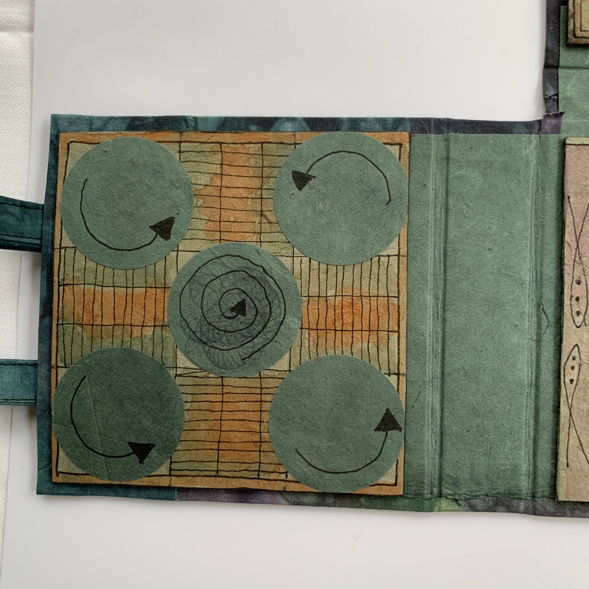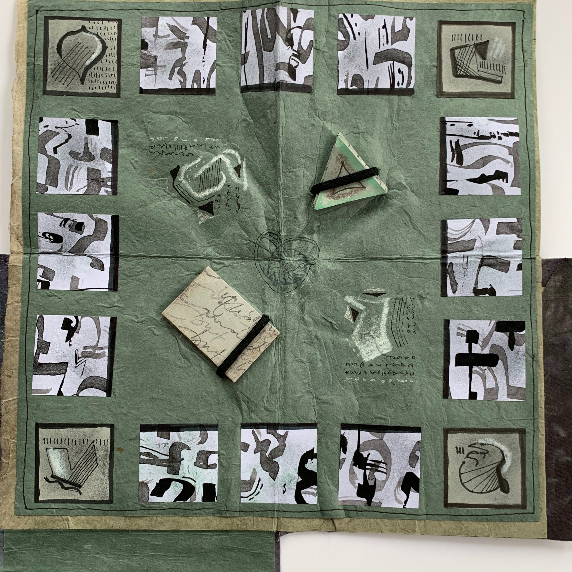 I used the idea of asemic writing and created an asemic game board. You can almost recognize each gameboard. A fun challenge and a true book binding lesson.