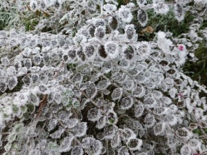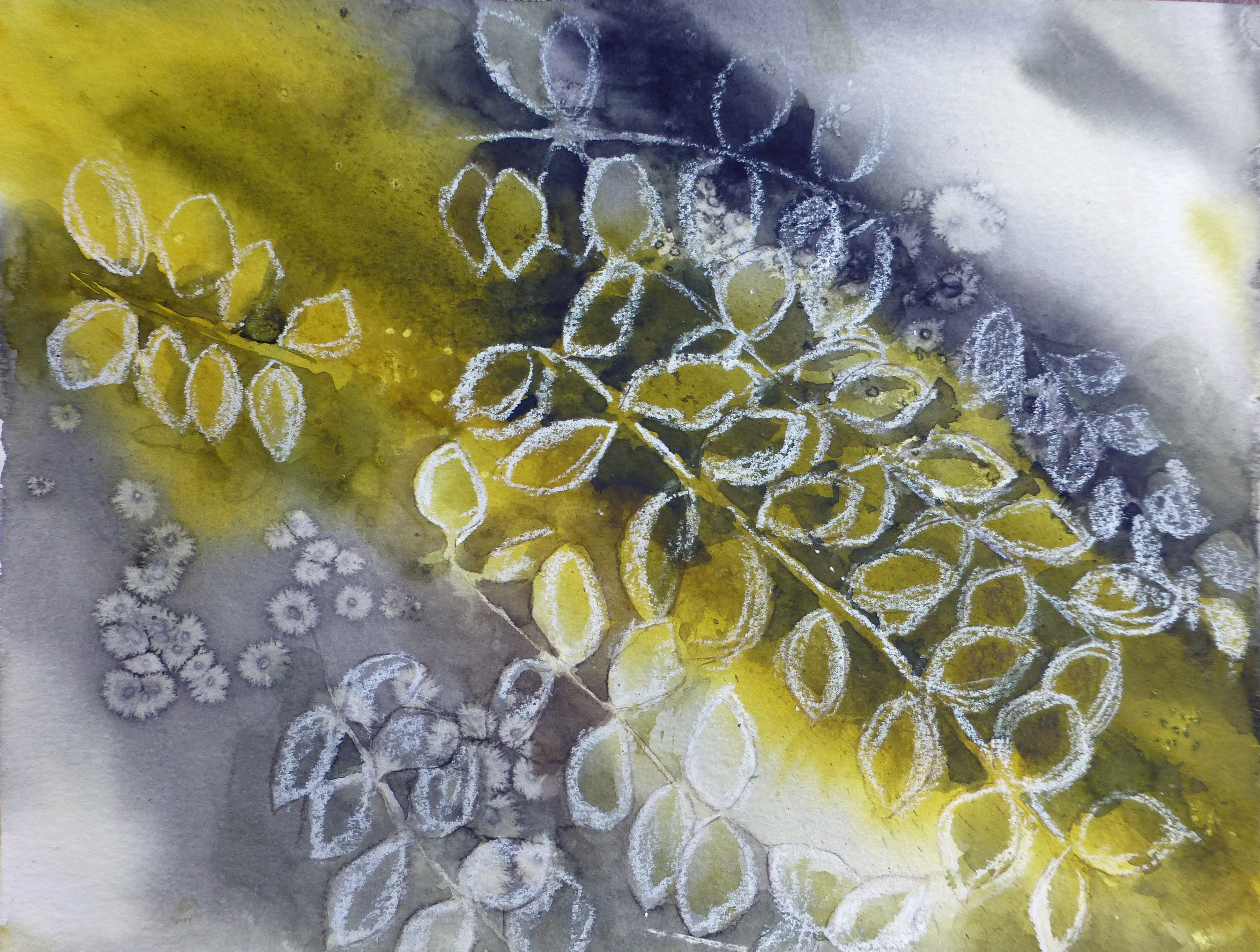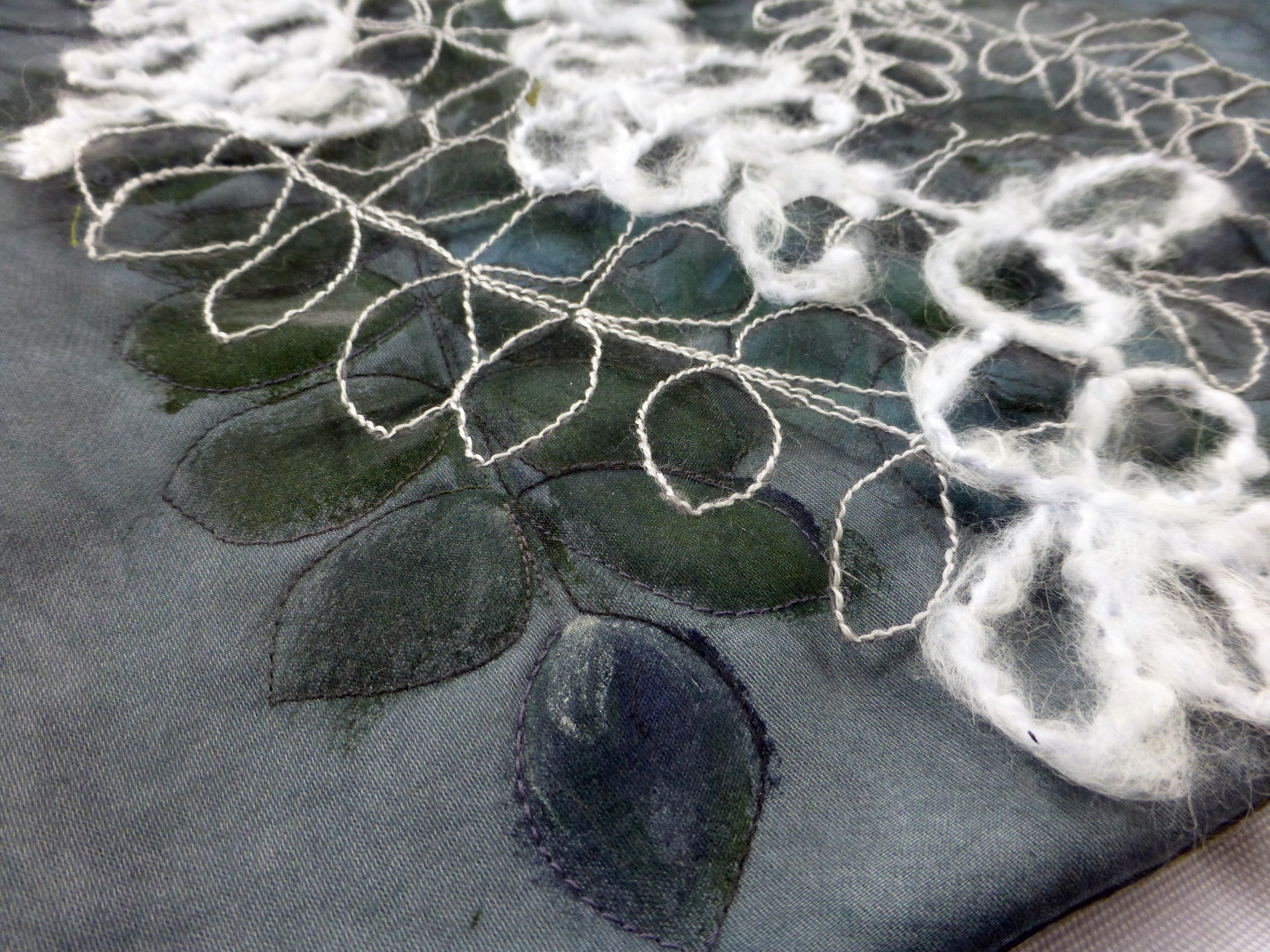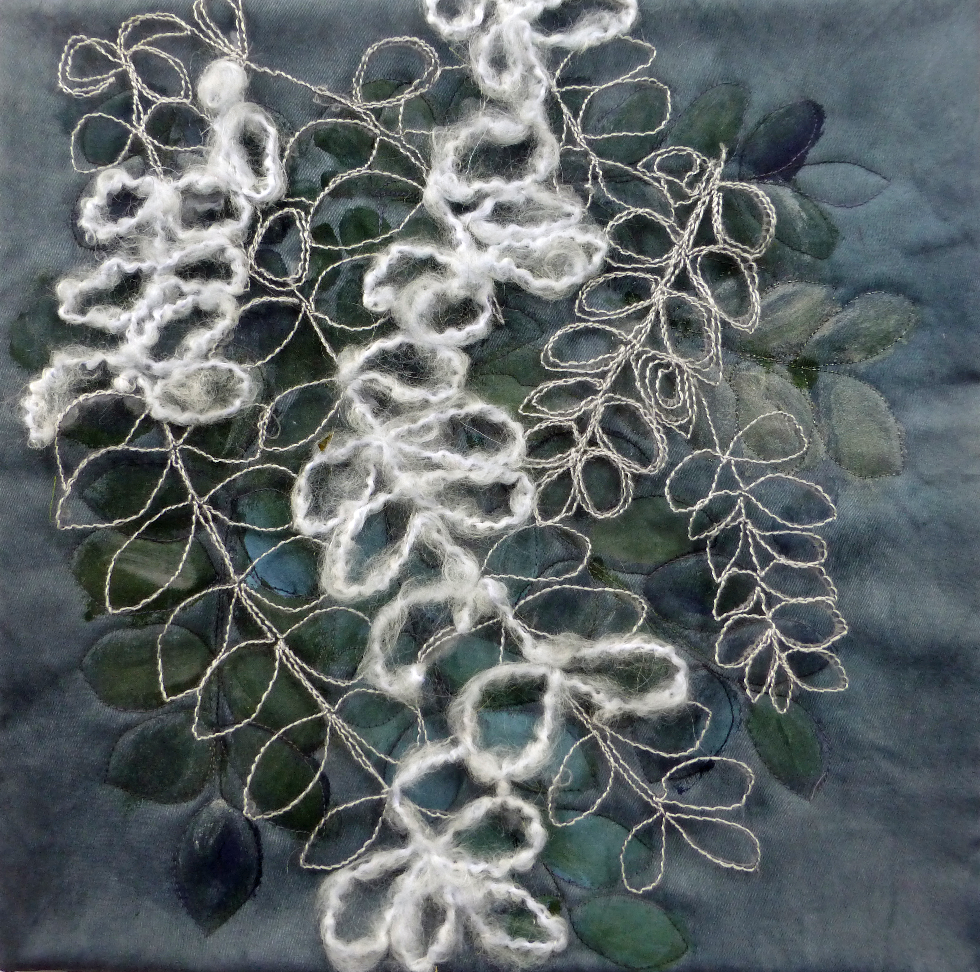 Winter Garden Space Textiles finding winter inspiration in the garden sewing machine drawings on organza, layered over painted and quilted fabric 30x30cm 2013 the photo the painting: china marker, aquarelle, salt