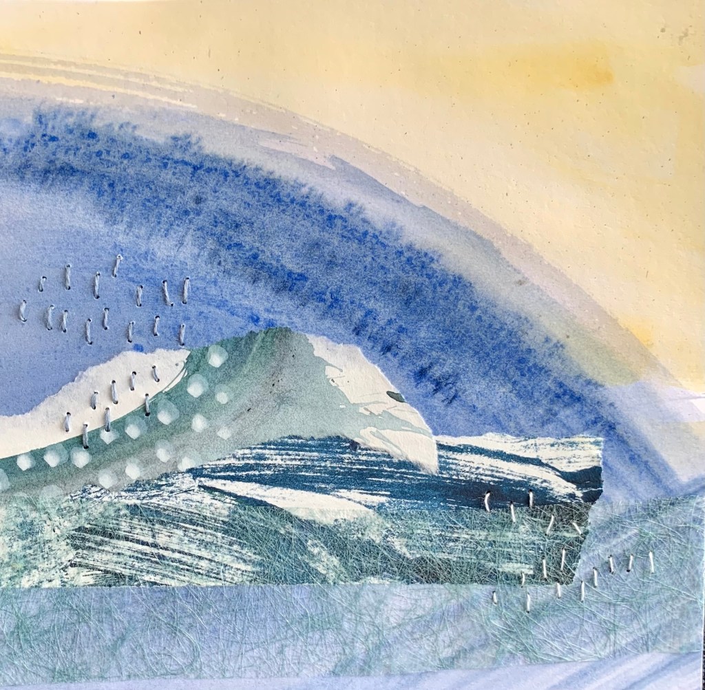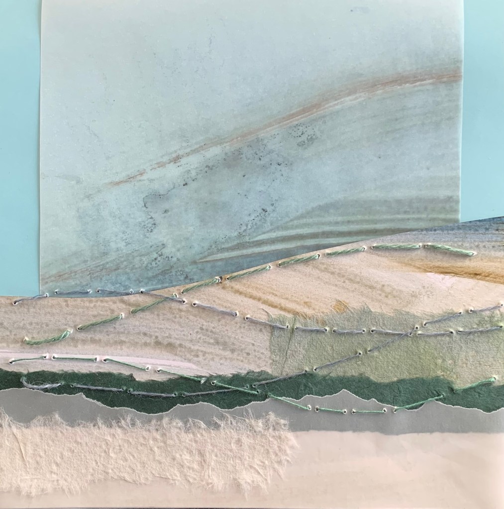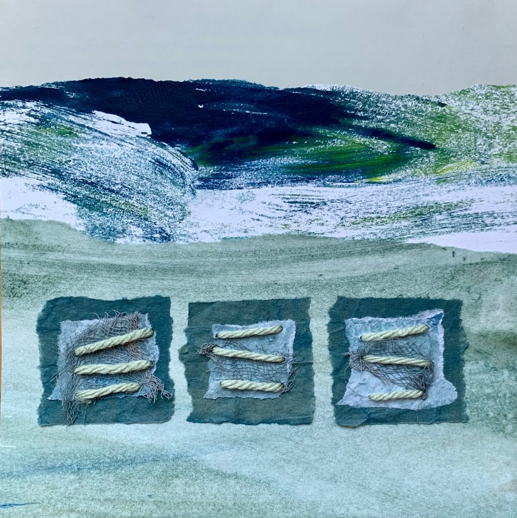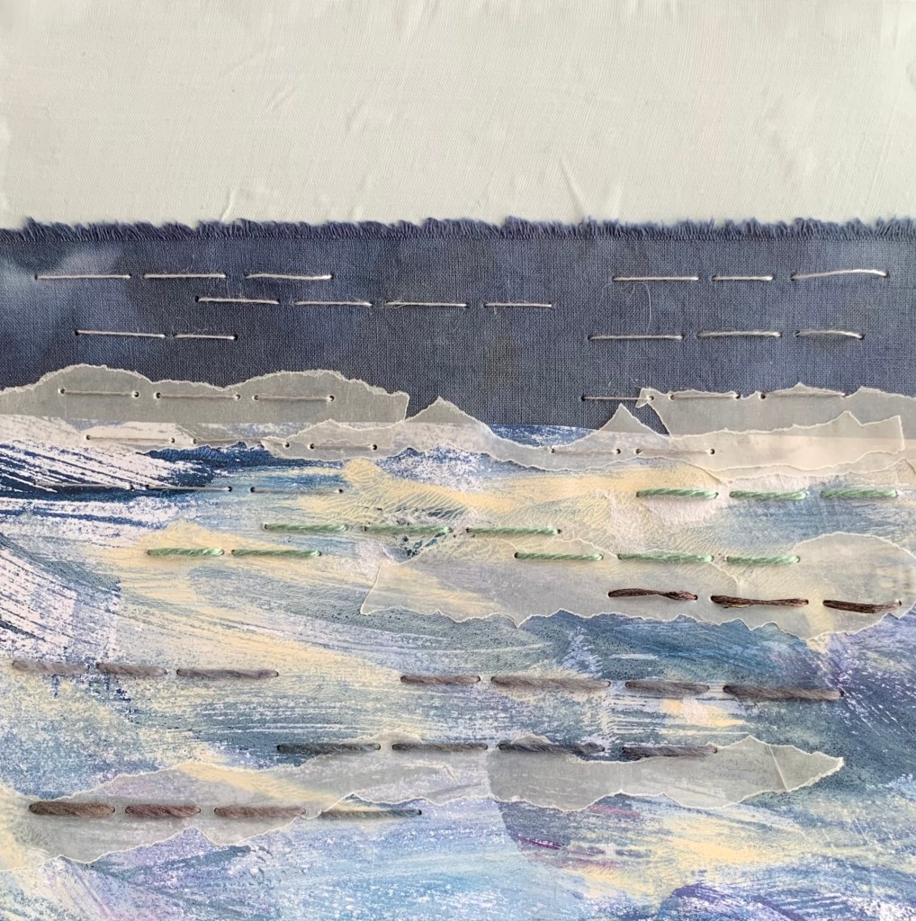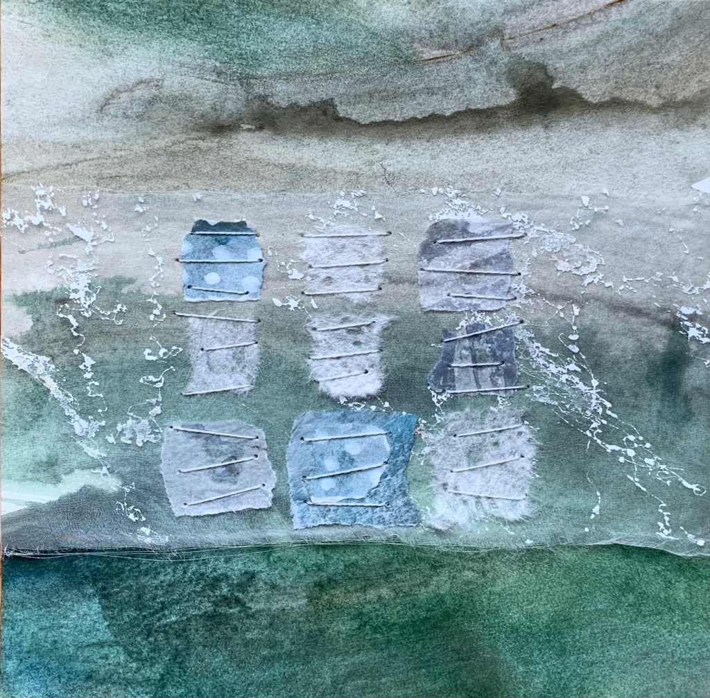 In the winter of 2023 we spent 5 weeks on the coast of Cape Ann in Massachusetts. It was a wonderful time in the full cold and wind of winter. To mark my days and remember them well, I made a series of collages. 20x20cm. I chose a monochrome palette with painted papers, fabric and stitch. I bound the collages into a book to keep them all together.