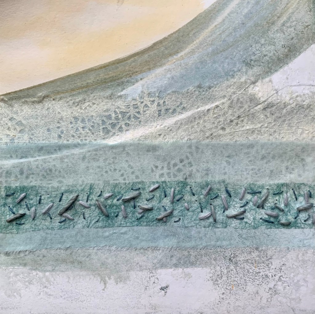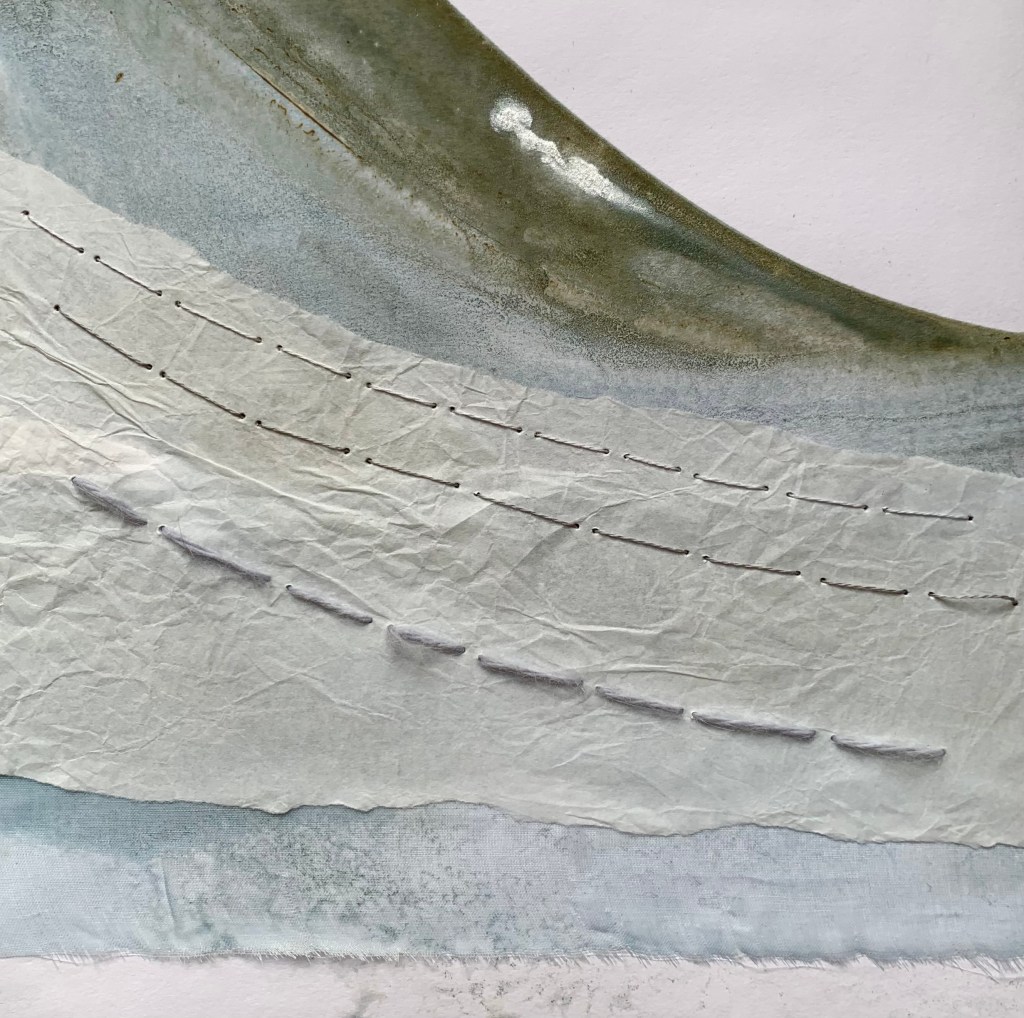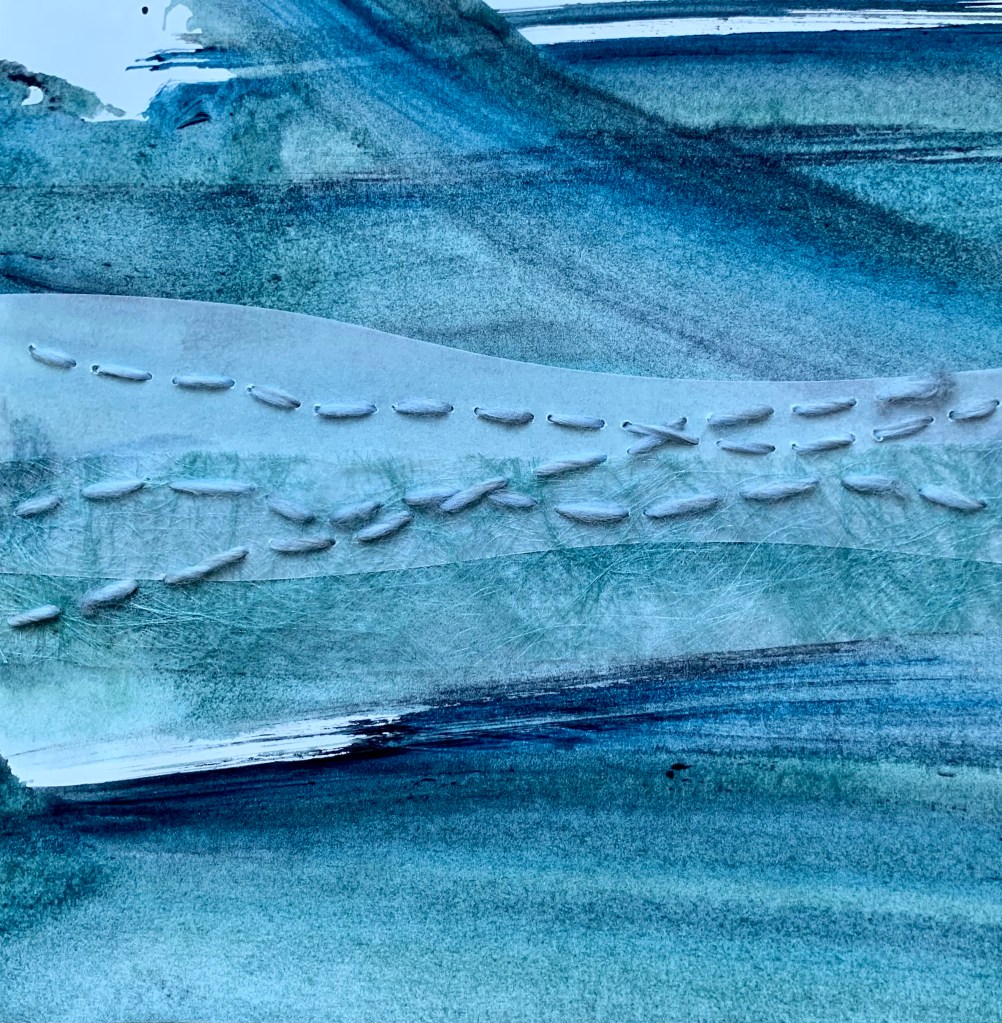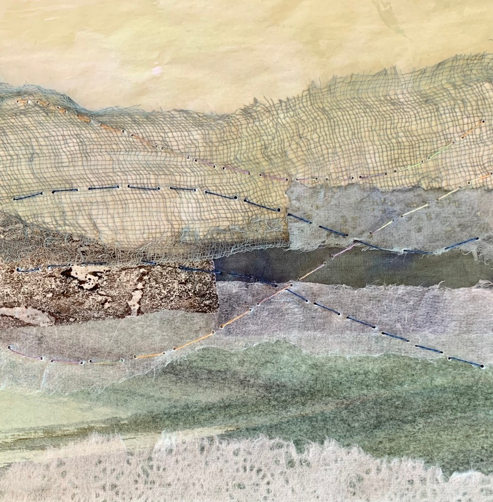 In the winter of 2023 we spent 5 weeks on the coast of Cape Ann in Massachusetts. It was a wonderful time in the full cold and wind of winter. To mark my days and remember them well, I made a series of collages. 20x20cm. I chose a monochrome palette with painted papers, fabric and stitch. I bound the collages into a book to keep them all together.