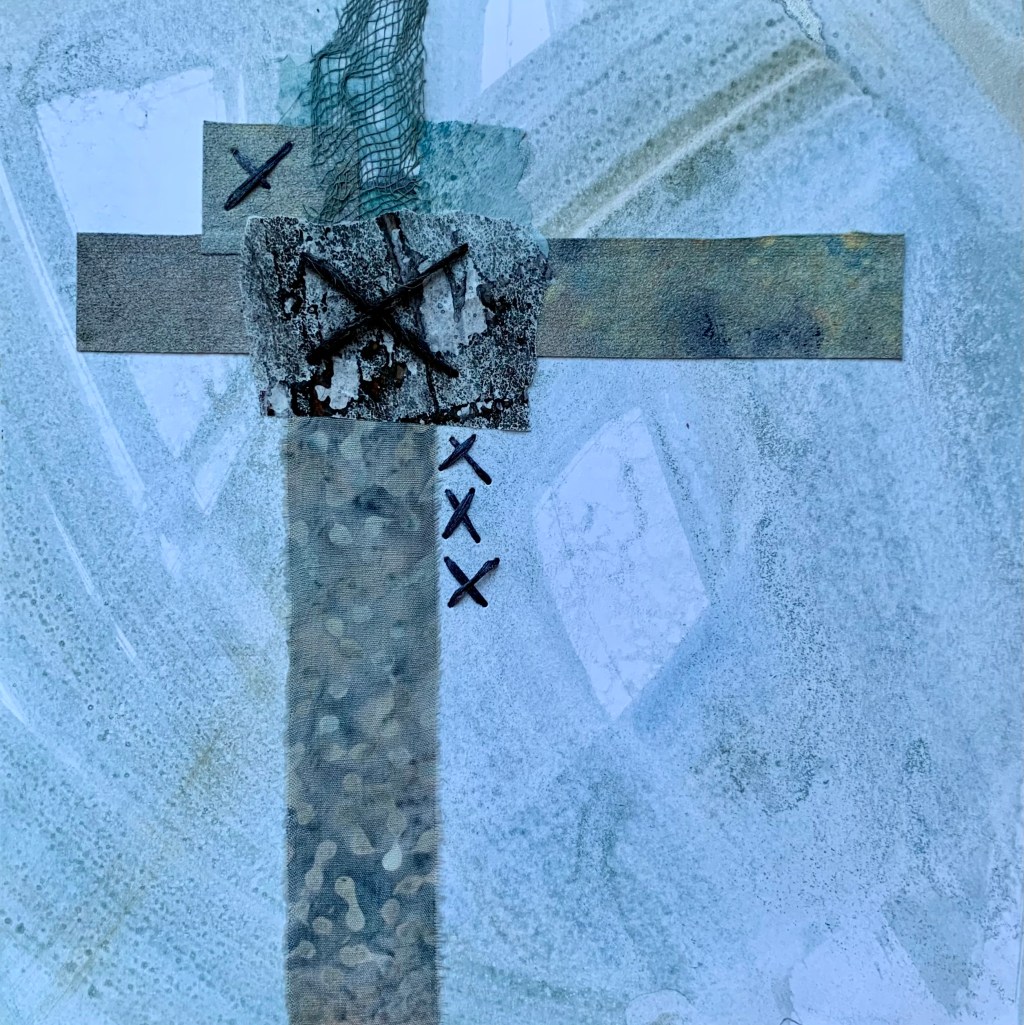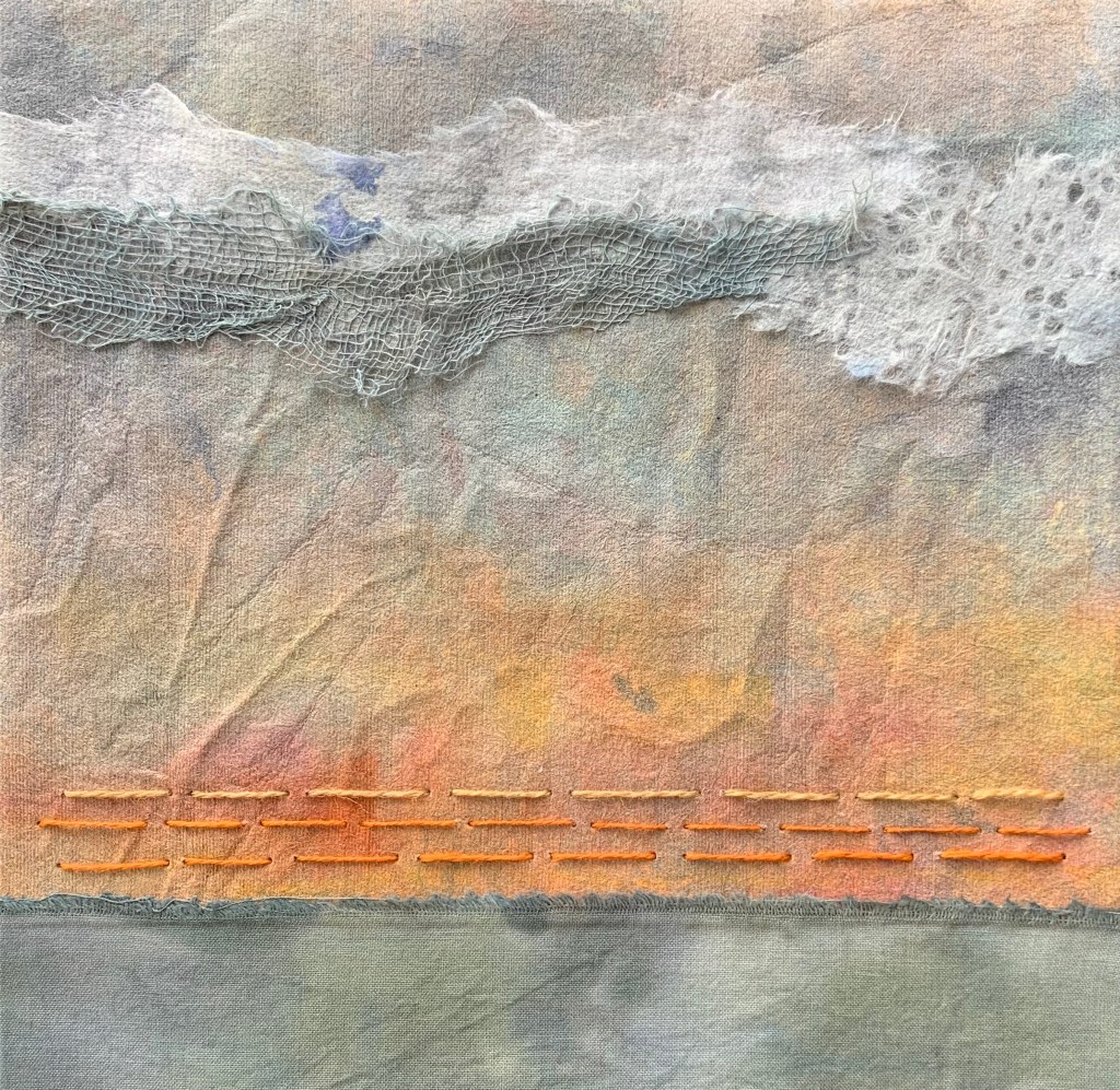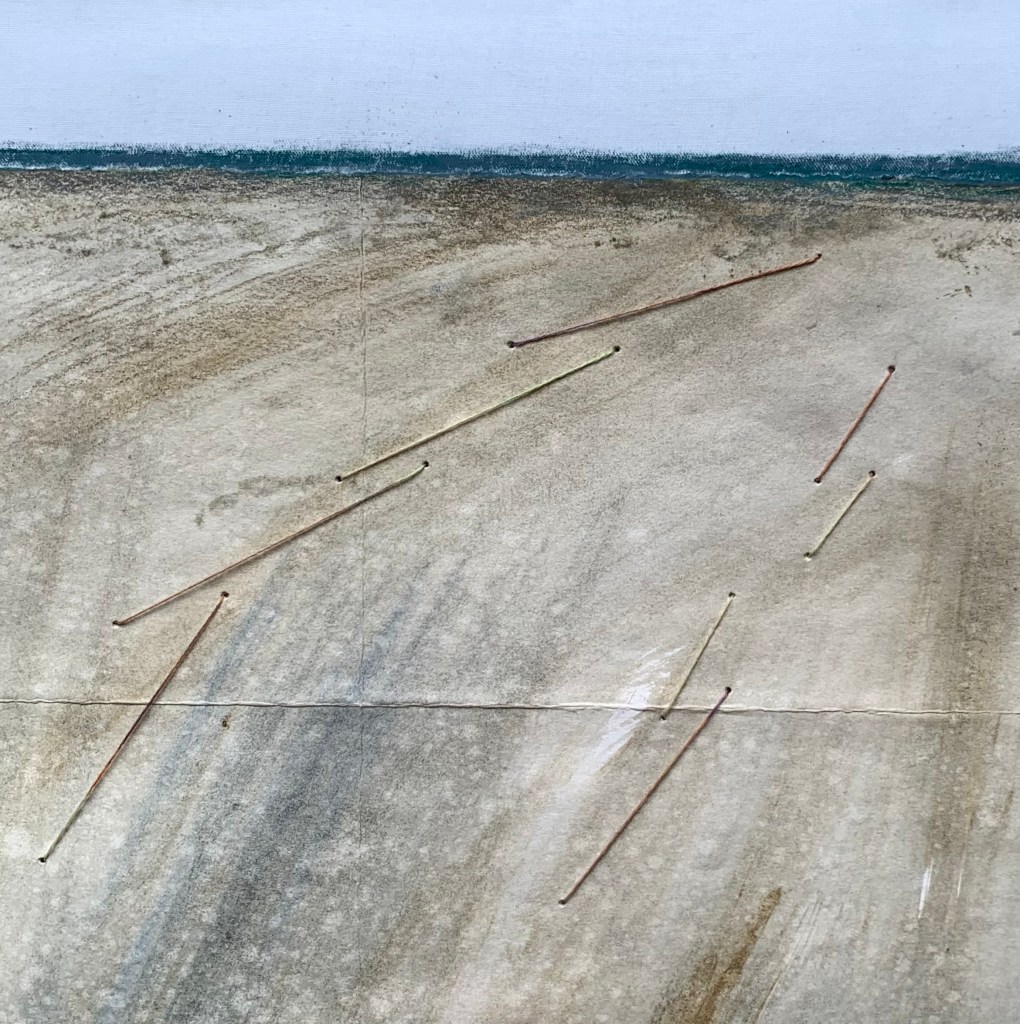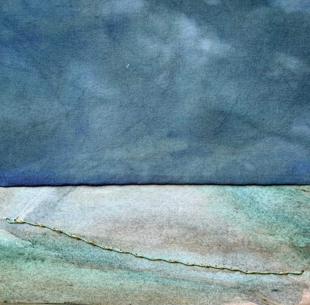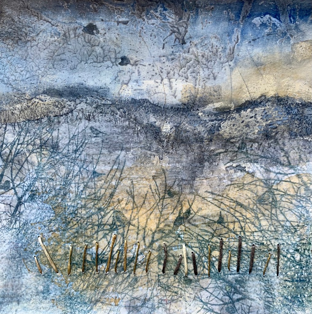 In the winter of 2023 we spent 5 weeks on the coast of Cape Ann in Massachusetts. It was a wonderful time in the full cold and wind of winter. To mark my days and remember them well, I made a series of collages. 20x20cm. I chose a monochrome palette with painted papers, fabric and stitch. I bound the collages into a book to keep them all together.
